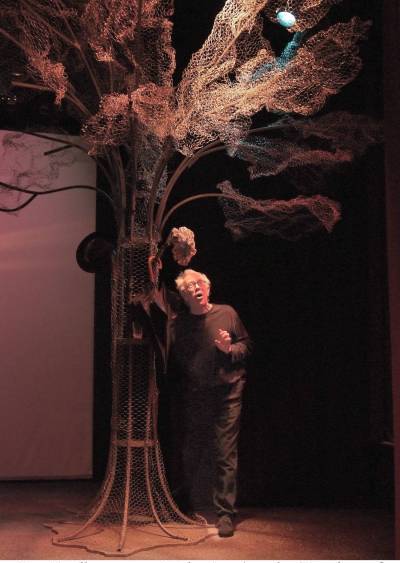 A nearly bare stage dressed with a solitary tree constructed of metal rods and crumpled chicken wire foliage, and a backdrop consisting of a single viewing screen that changed color was the tableau on which nine totally enthralling stories from the inimitable Ray Bradbury came to life opening night at the Fremont Theatre in Pasadena, California.