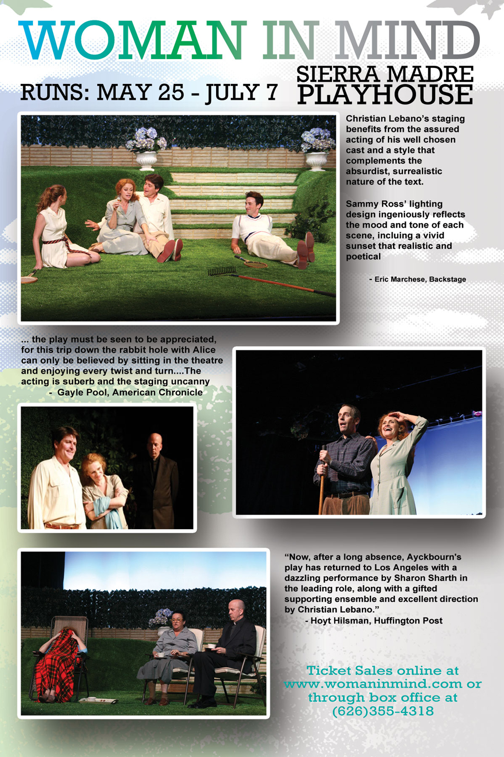 A most intriguing play opened at The Sierra Madre Playhouse to a packed house. Woman in Mind, skillfully written by Alan Ayckbourn, is marvelously directed by Christian Lebano who allows the story to unfold bit by bit as we are taken deep into the mind of a troubled woman named Susan.